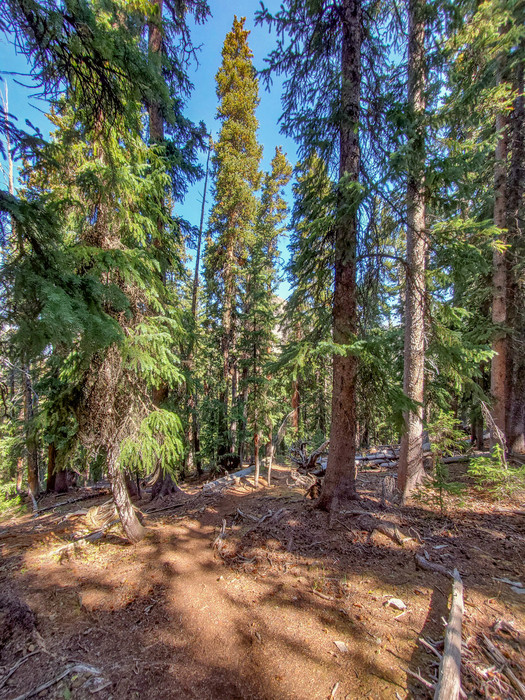 The fairly well worn unmaintained trail provides a route through a thick forest and around numerous dead falls.
