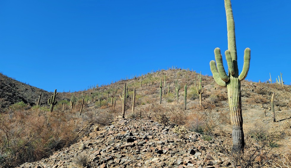 This hillside along Go John was burned here and there. It has lots of saguaros. How many will survive?