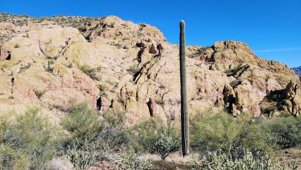 One young saguaro yet to grow an arm with a layered Goldfield Mountains background.