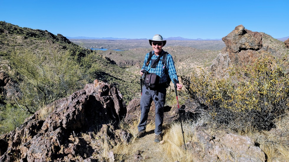 Larry at the saddle with Saguaro Lake behind. You can see the river too though just barely.