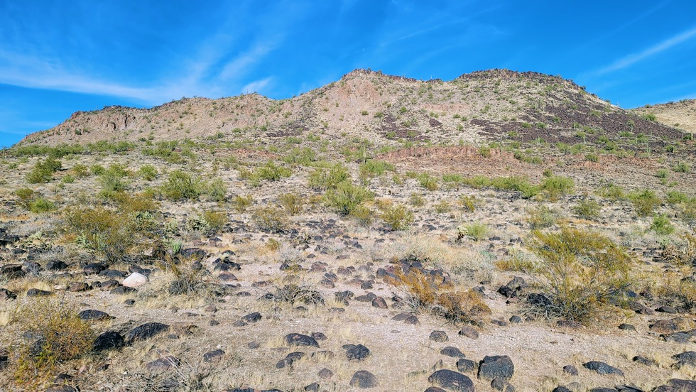 coming around the southwestern side you can see a layer of a rock-like cliff wall to the right. The Ridgeline Trail is on the other side of the top of this hill.