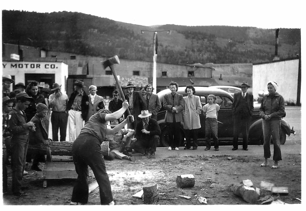 My Grandmother in a wood splitting contest during a Forth of July celebration in Alma