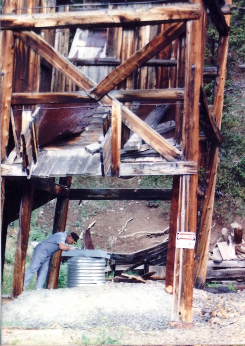 My father looking down the shaft of the Mineral Park Mine were his father worked in the 1940's. He spent many hours here over Christmas & Thanksgiving holidays playing in the pump room & compressor room while his father was below ground digging out ore that he stored in bins until he could ship it after the snow melted off in the spring. The mine was a little over 3 miles up the side of the mountain from the families cabin down in the valley near Alma. My Grandfather would use snowshoes to get up to the mine every Monday and would spend the week in the cabin near the mine and then snowshoe back down to see the family on weekends. He did this in the winter and ran a logging operation in the valley during the summer months.