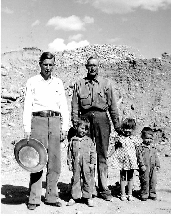 My father (far right) with his father and grandfather, sister and brother at the Alma placer where they panned and sluiced for a days pay