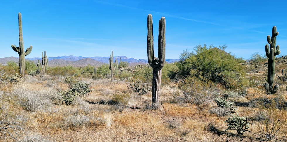 some nice saguaros here as I look north. I thot the one of the right was particularly interesting as arms are growing out of the base.