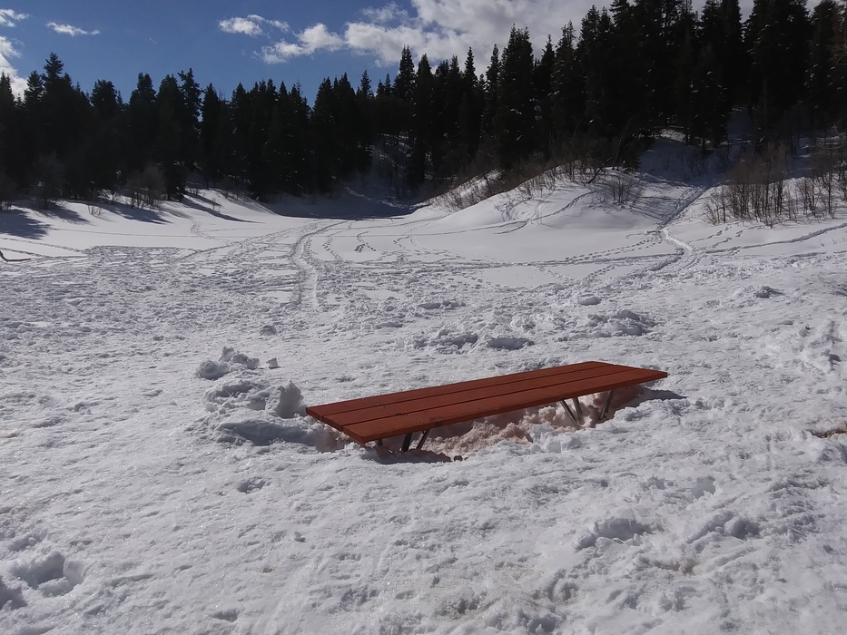 Green Pond. Or should I say "Snow Pond". The snow level was almost up to the picnic's tabletop!
