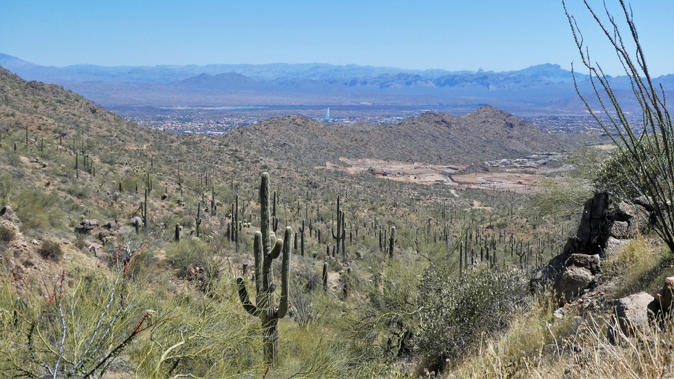 from the trail looking east toward the fountain via the saguaros.