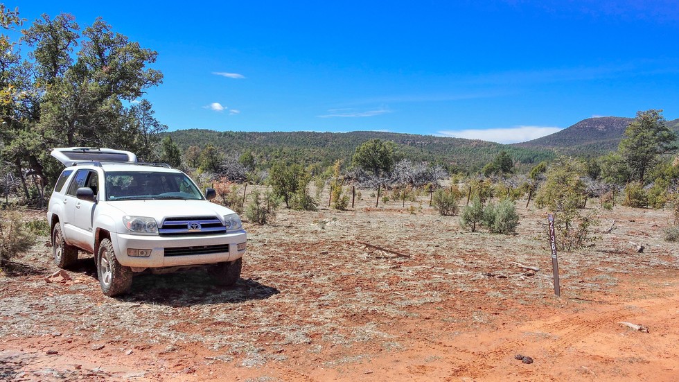 Parked on FR2738 near the start of the off-trail hike to the viewpoint. Note the gray dead piles of trees and brush beyond the fence. Buckaroo Flats is dotted with these piles from a tree clearing effort by the Forest Service to open up more grazing land. Normally the piles of dead wood are burned after clearing but evidently this project was stopped before reaching that stage.