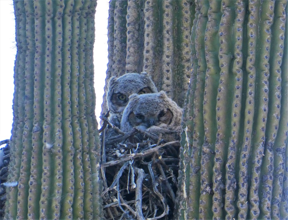 first nest the two were barely high enough in the nest for me to get a photo. Once again, mom is not around and I looked altho I did see a rather large bird flying low about 1/2 mile away but I couldn't make it out. Maybe if someone hikes out this way a little later in the day they can catch mom at home.