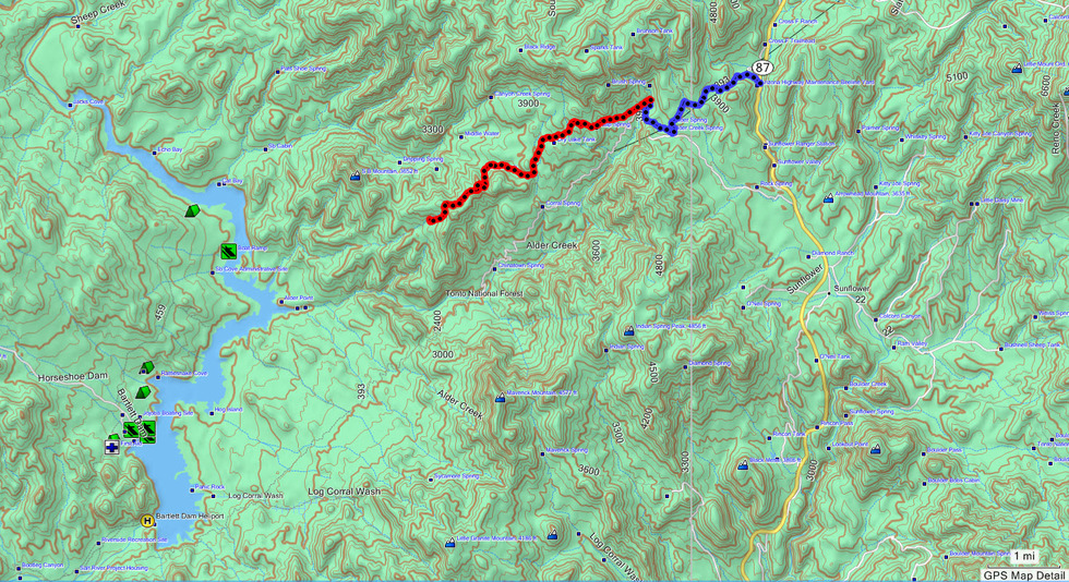 Old highway 87 near shutoff - FR393 (blue) - hike 4WD road (red)