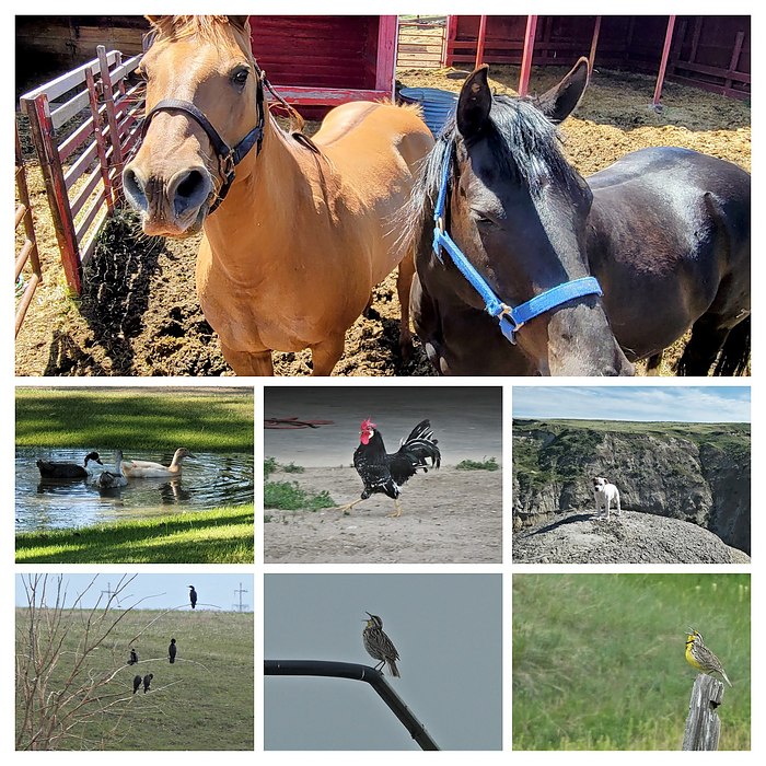 The middle photos are the ducks that gathered in the little pond created by the leaky watering hose. The Rooster is one of TOO many at Greta's Hen House at the homestead. The dog, Puja is a new purchase by my cousin. We are at Sheep Coulee near the Marias River.