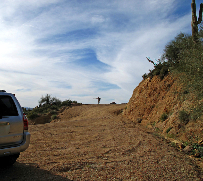 From this pic#1 TH Parking area, hike up FR143 for 100ft where this guy in the pic is standing & pointing which is the TH Start for this hike; See next pic#3 for your next hiking destination .30mls cross-country downhill to cairned trail intersection;