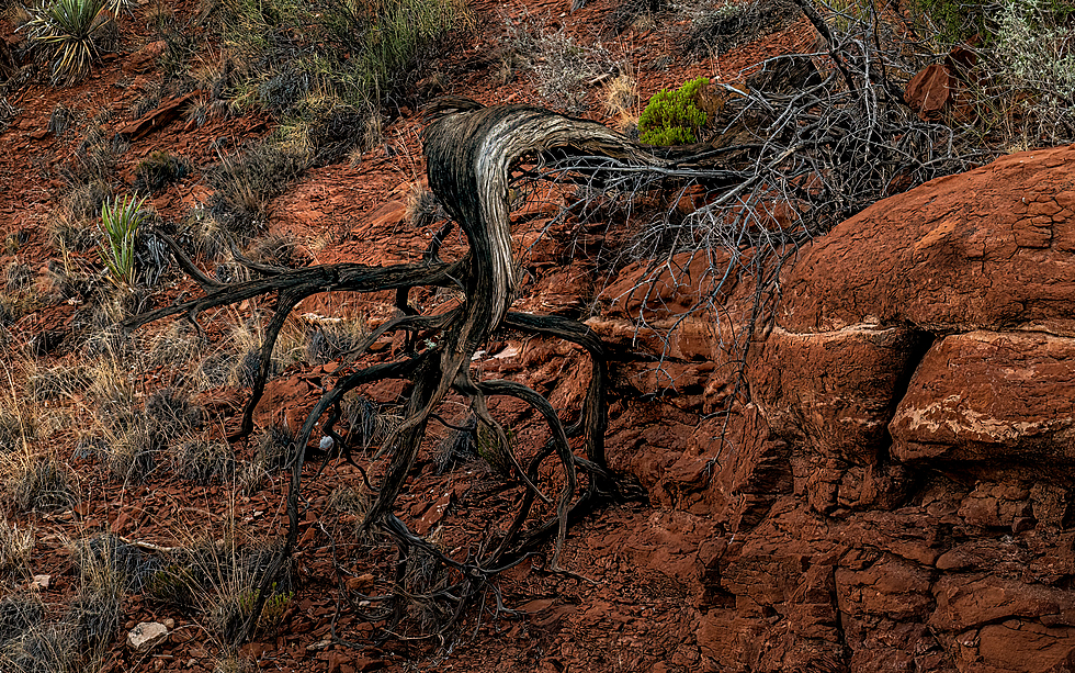 Interesting. Maybe not a deformed tree, but an alien invader laying dormant and camouflaged awaiting the right moment to burst out and eat unsuspecting hikers. (Some resemblance here to the Martians on the War of the Worlds.)