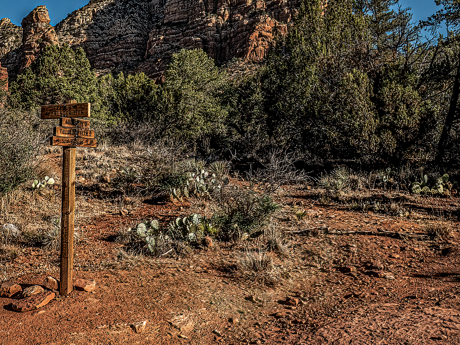 Official trail signs to the left. None say Keystone Cave trail. That trail starts at the thin, long branch to the right. A note on respect for microbiotic crust, that delicate layer of soil and organisms critical to growth and stabilization of extreme environments. The need for such respect creates a tension with hiking off-trail on unregistered trails. Sedona, I judge, receives sufficient rain and experiences sufficiently moderated temperatures at times, that hiking established unofficial trails, on balance, creates minimal harm. But that tension remains, and should be a factor in choices of hiking adventures.