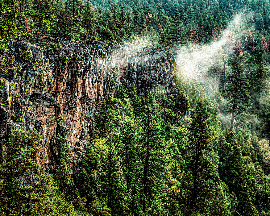 Lookig hard east, we have here a more reddish rock formation. Topped with black. Not clear how to relate this formation to the predominant white colored formations that dominate the other views. But scenic nonetheless, with added wisps of morning mist.