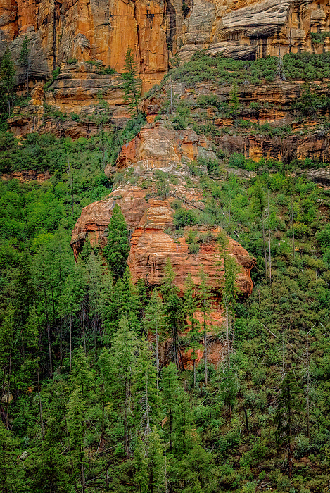 The colorful contrast of the orange-red rock and the green of the tall pines