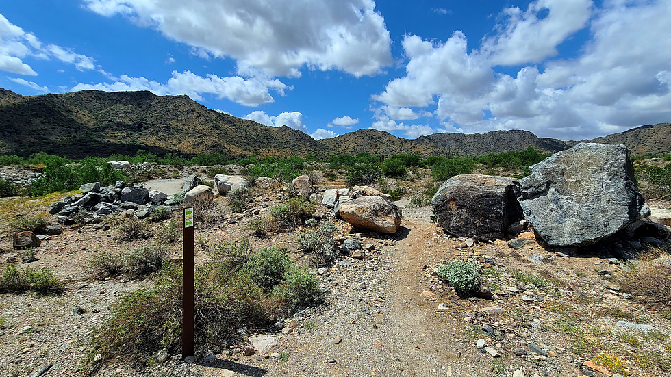 One of the green arrows says Petroglyph Trail. For a quicker hike, the dark boulder on the right probably has a modern glyph.