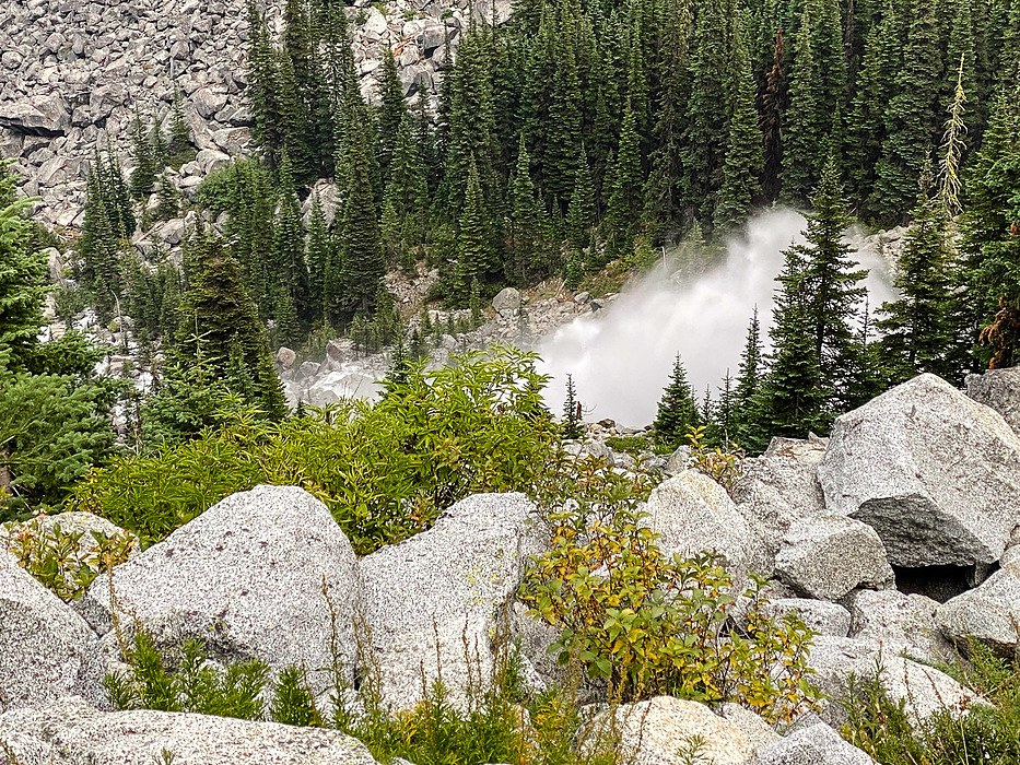 Throttled outlet of Snow Lake. The water just emerges from the ground here. Before this was wilderness, this remote controlled pipe was installed to regulate water to the Leavenworth Fish Hatchery. When turned on, it is spectacular.