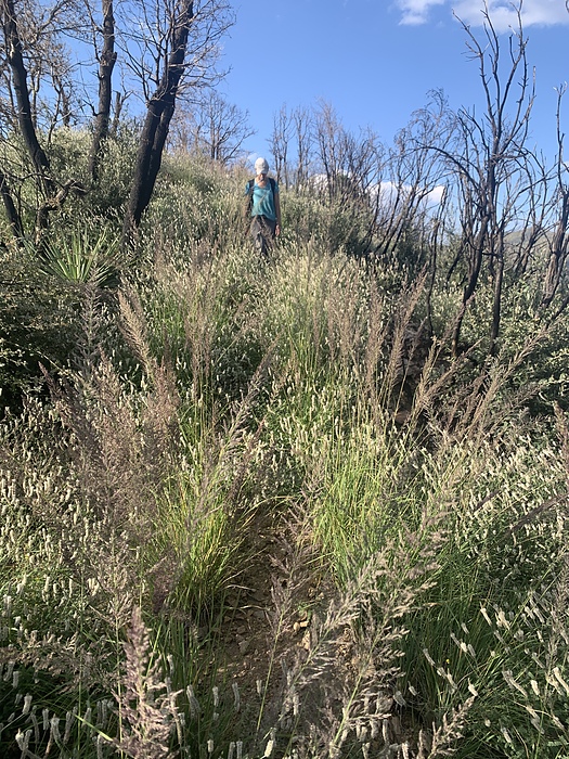 an example of the trail overgrowth on the Red Ridge... and this is just one of the better examples where the weeds are only knee to waist high and you can see the trail in the weeds in spots. On Oracle Ridge and Catalina Camp, it is way thicker in a most places and can be shoulder to head high.