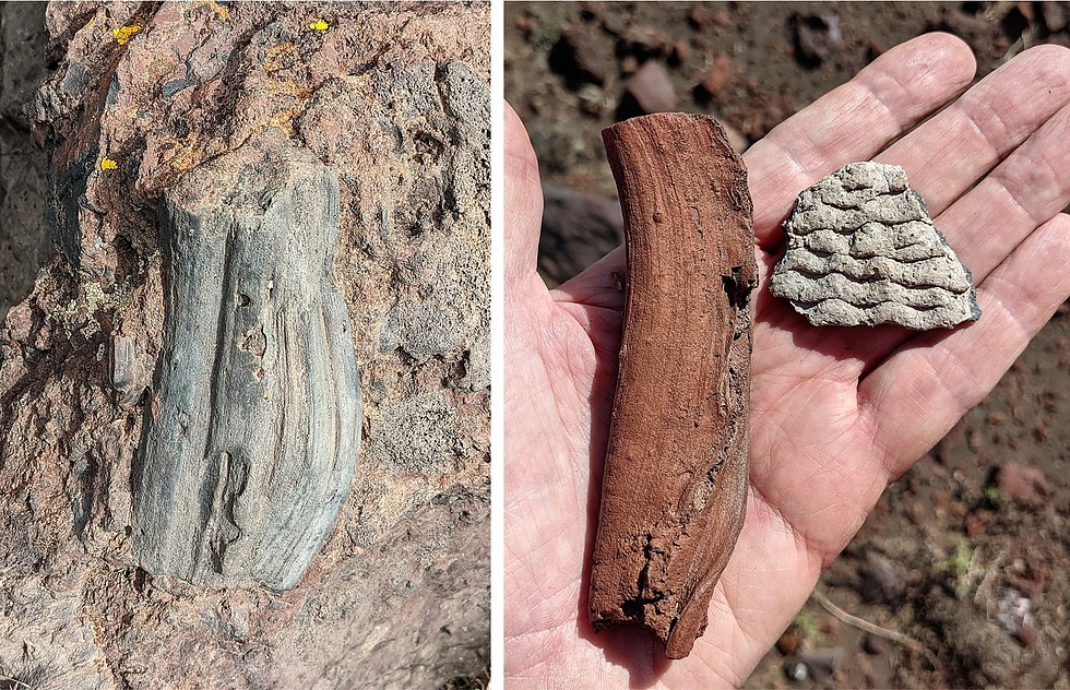 I noticed the corrugated sherd and the odd red rock near it. I wondered if it might be a petrified bone. Later on I passed the similar looking rock on the left embedded in the volcanic rock, so maybe just geology. Any ideas? @PaleoRob?