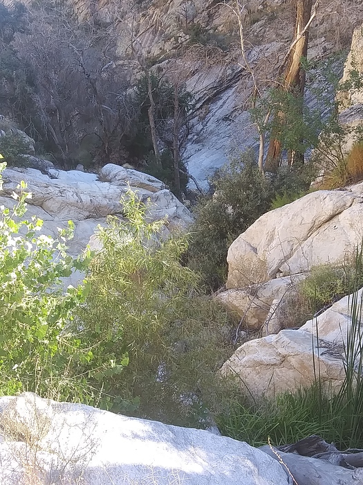 "A Dead End"? Finally came to a point that we can't navigate around without significant backtracking and trying the other hilly side, but it looked difficult even if we weren't tired. That option would be dangerous. Tall rock cliffs to the right, definitely impassable. The creek is down below on slick rock and curves around the bent. Unsure if terrain is passable.