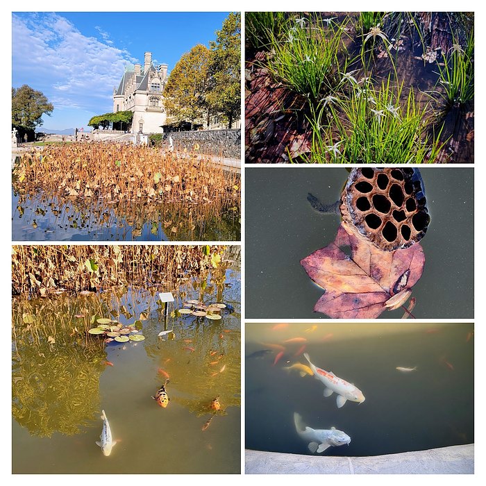 Biltmore Italian Garden ponds are full of life. The lotus flowers in autumn are quite interesting. (three symmetrical pools, grassy panels, and Italian sculptures)