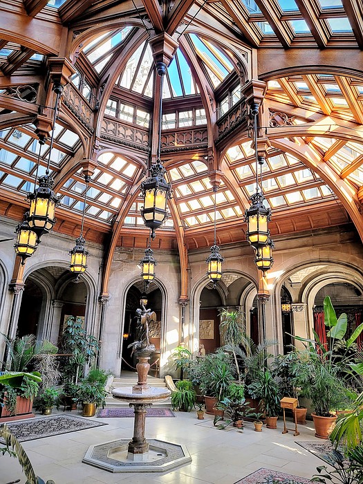 the sculpture “Boy Stealing Geese”—the centerpiece of the Winter Garden. Karl Bitter, a Viennese artist who immigrated to America in 1889, created the beautiful marble and bronze fountain sculpture located in the glass-roofed garden room.
