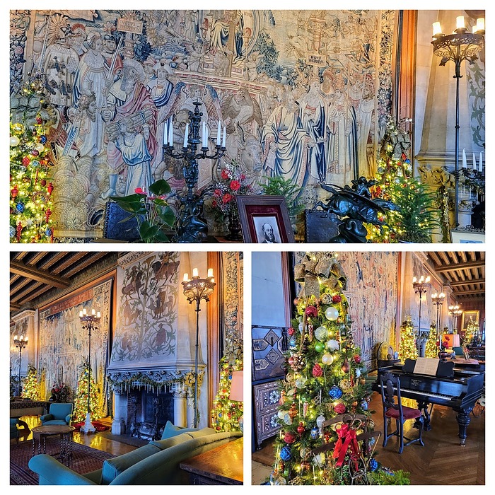 The 16th century Flemish tapestries provided insulation as well as inspiration from the complex allegorical stories. The hand-stitched tapestry features costumed men and women of the court. They hang next to the immense fireplace.