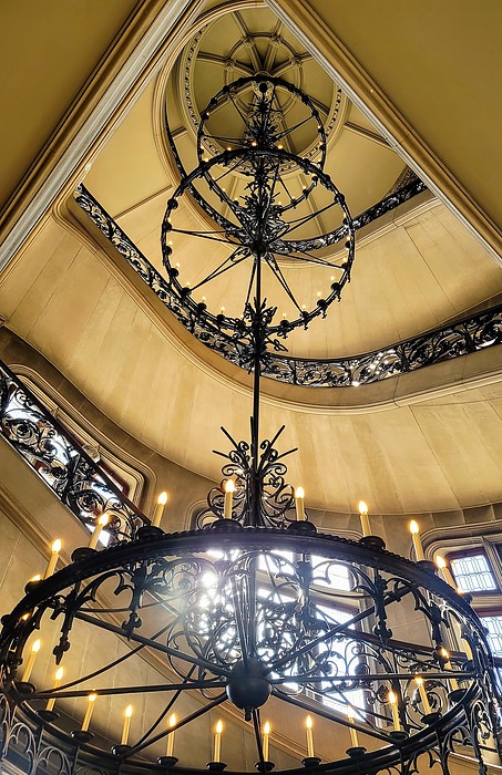 There is a 1,700-pound electric light fixture suspended from the middle of the four-story grand staircase. It hangs from a single bolt that runs through steel girders under the dome roof. The bolt has been replaced only once since the house was built. Wisely designed, the copper dome opens for easier access to the fixture. I will see the Copper Dome tomorrow during my Rooftop Tour.