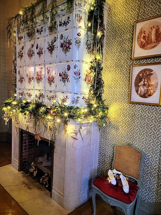 The focal point of the Tyrolean Chimney Room is the overmantel, constructed from an antique tile-stove known as a kachelöfen that George Vanderbilt most likely purchased in his travels through Europe. Stoves like this were used in central and northern Europe from the Middle Ages to heat castles, palaces, and ecclesiastical buildings. Eventually, they came to be used in the residences of the wealthy. Created in the 18th century, it is comprised of tin-glazed earthenware tiles hand-painted with exquisite floral designs.