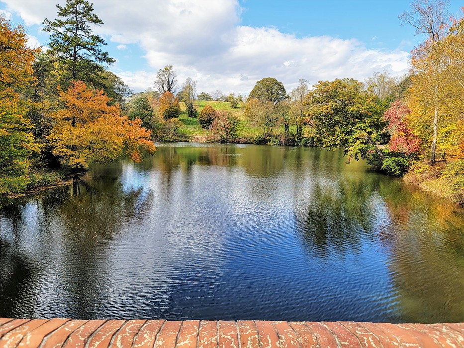 another place where I would be tomorrow and I would hike down from the Biltmore House and circle this, Bass Pond. I'm glad I got this picture though as the next day it was a little gloomy. The Bass Pond is a significant Biltmore Estate water feature, created from a creek-fed millpond. This bridge was featured in the Hollywood film, The Last of the Mohicans.