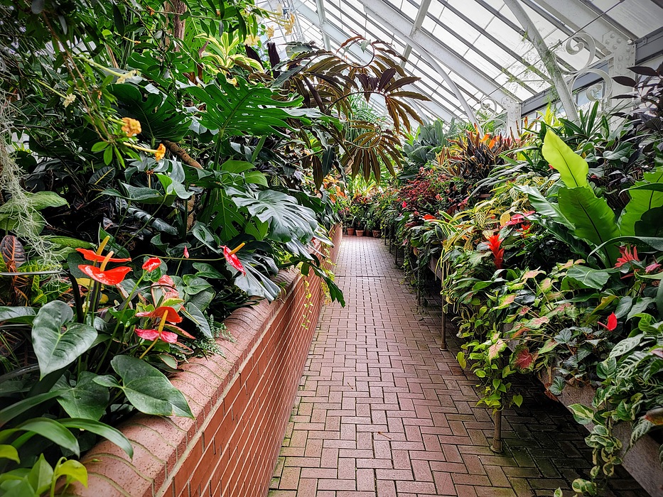 The alleyways adjoining the Hot House and Cool House are filled with plants for guests to enjoy. The Hot Alley features Bromeliads, while the Cool Alley showcases plants from the ginger and Heliconia families.