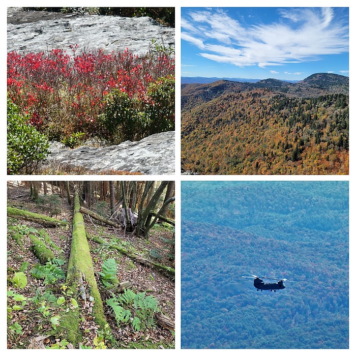 UL This red flora is at the top of Devil's Courthouse but Google couldn't help me ID it as I was too far away. This is a zoom. Anyway, it really stood out. LL so much moss covered stuff here and in the Great Smoky Mountains. This was so soft looking... and look how green the ferns are for the end of October.