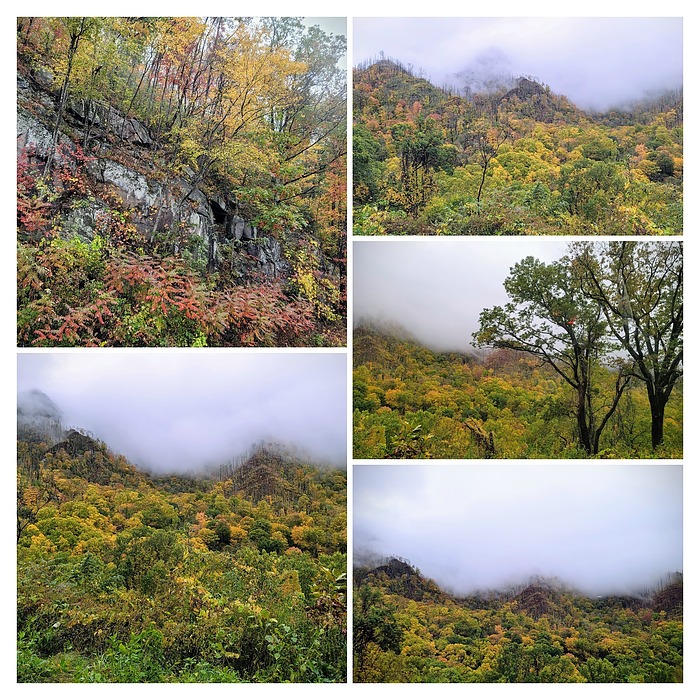 This was quite the stop as, believe it or not, it was photo worthy on both sides of the road. It is between the Chimney Tops TH and Overlook. Except for the photo on the UL which is the other side of the road, this is the view, mostly toward the Chimney Tops... well we didn't exactly see the Tops due to the hovering clouds. Once again there is a major hiking trail near here.