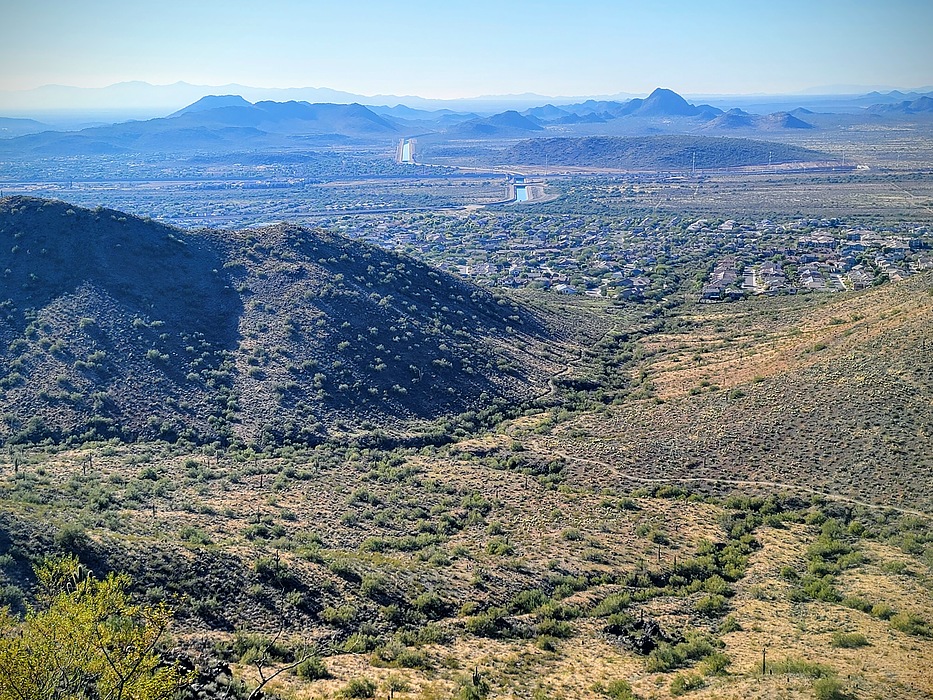 from atop Dixie Peak looking to the west. You can see the haze. Pyramid Peak on right, Deem Hills on left and I think Thunderbird behind them. Far background left is the White Tanks. Part of the Dixie Mountain Loop that I'll be on in an hour or so is below.