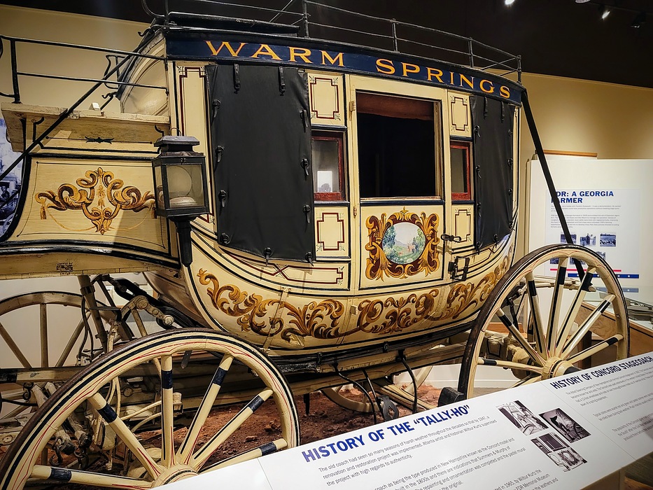 This Concord model stagecoach was built in the late 1800s. Nicknamed the "Tally-Ho", it was used for many years to transport visitors to and from nearby towns and railroad stations to the Merriwether Inn near Warm Springs, Georgia. When FDR bought the resort, this coach was a part of the property.