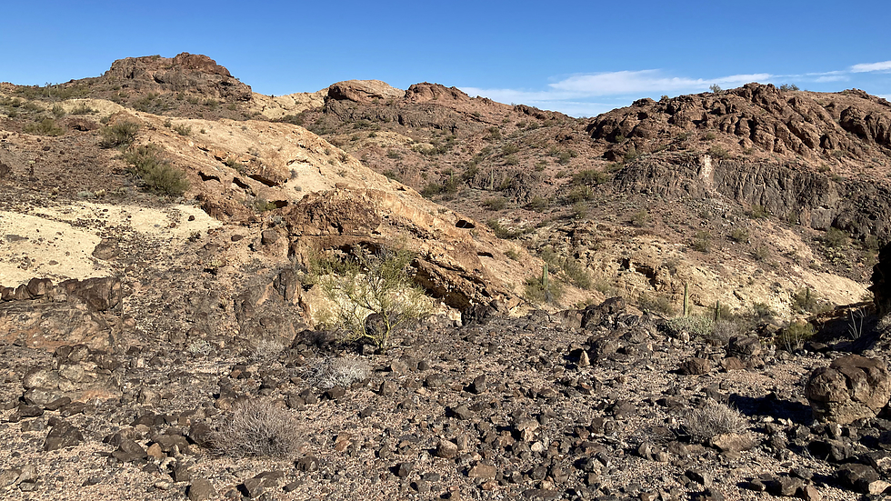 The contrast between the yellow and the black rock is distinct in places. Needless to say, it was significantly warmer hiking across the black stuff.