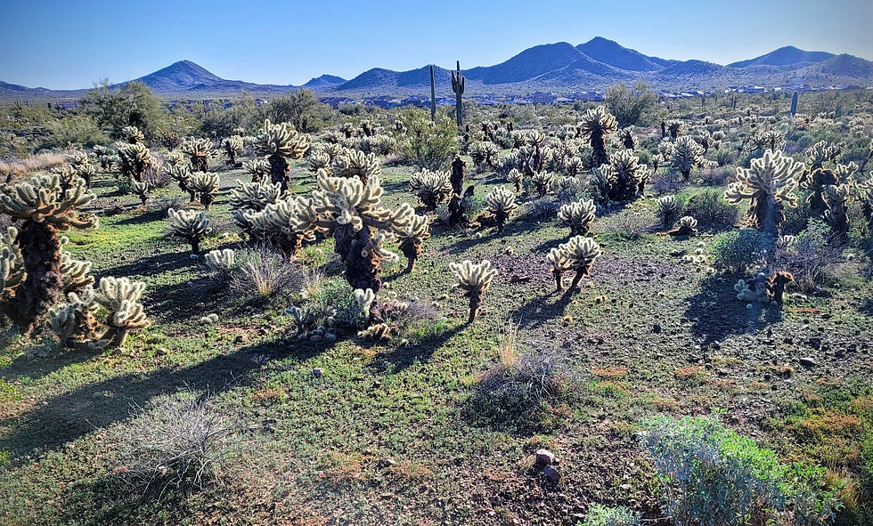 the sun was backlighting the cholla above the green green grass of the desert... or whatever that ground cover is and I would venture to guess it's more like weeds. Nonetheless, it is a pretty color contrast. I am looking south to the Phoenix Sonoran Preserve. Union Peak on left. Western Vista on right.
