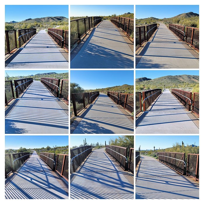 No, I didn't get carried away with taking pictures of bridges. My collage maker only goes up to nine. There are ten bridges on the two miles of the West Paseo that I hiked. I still can't find any info about these bridges. They are very nice and as you can see there is railing on both sides.