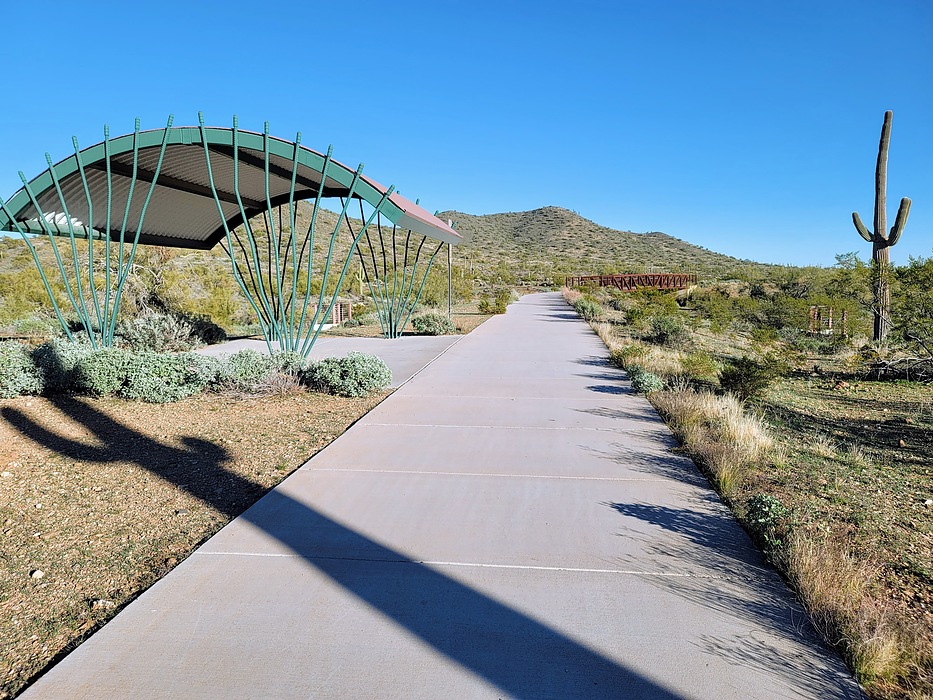 This is looking back/east with a saguaro shadow and the shade structure and a bridge. There is also a couple water/erosion control structures in center of photo (next to saguaro and on the other side of the shade structure) Ridgeback Peak is in center.