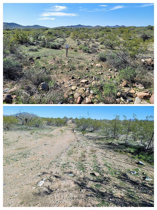 Top photo is remnants of an old road (view looking west) that goes east/west. It lines up with Dove Valley Road. Bottom photo is looking east at the old road.