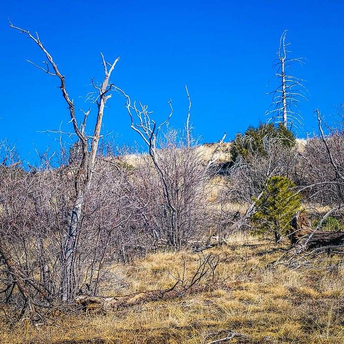 More of this. I include this many fire photos to show how much of the trail landscape passes through fire impacted sections. I do not bemoan this barrenness though, but observe, since as noted in the last photo, fire can occur naturally, and just like a stunning stand of pines is part of nature, this landscape is also.