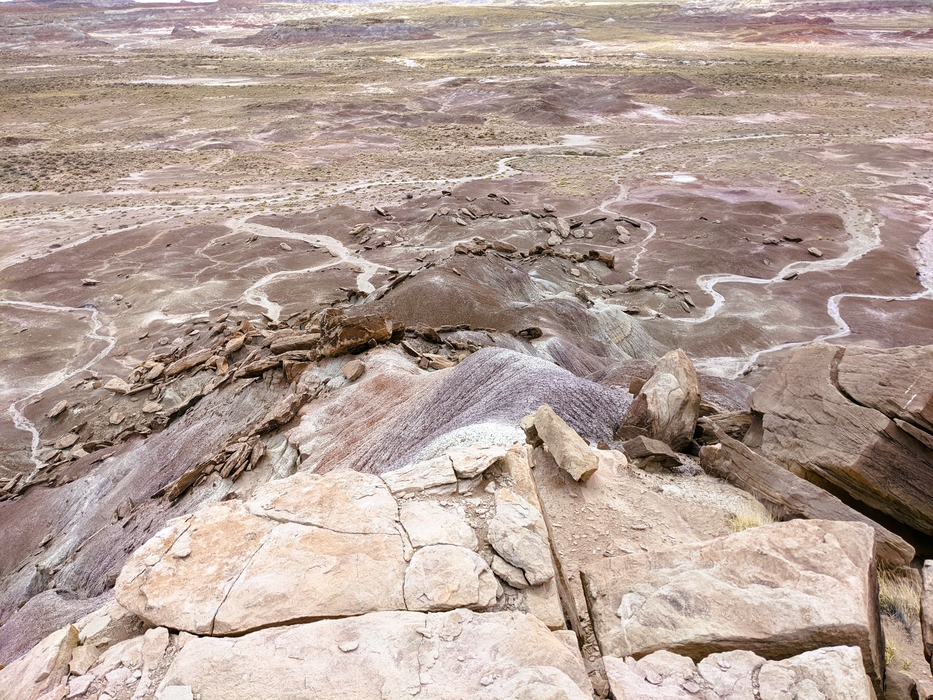I had hoped to loop back off the mesa, but the mesa corner I hit said no. In particular that bare purpley ridge in the foreground is way too steep and slippery to walk on. Turned around and went down near where I came up.