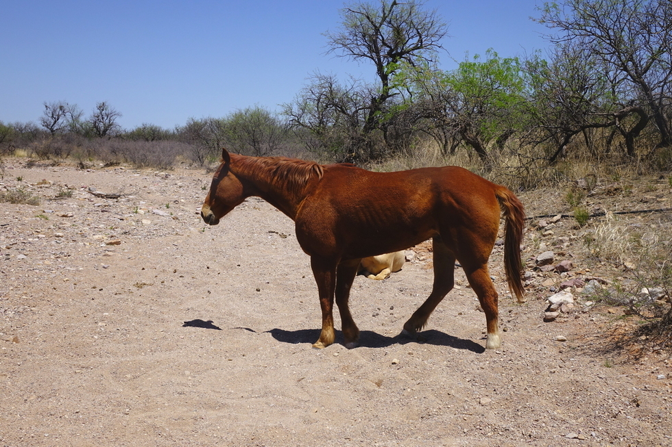 This horse was very lame and thin. I gave it some water and left an old cooler I had with two gallons of water in it after I took the top off. Stopped off at a ranch; a cowboy knew who owned the horses and got an ATV out and put a little hay on it with some water and got a rope to check out the leg. I gave him the top of the cooler and said he could have it; you would've thought I gave him a great thing.