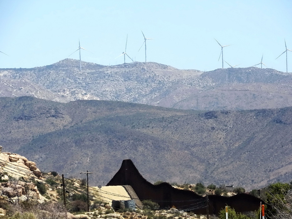 zoom of border wall and wind turbines on distant ridge in Mexico