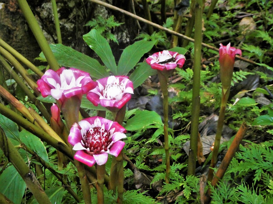 Etlingera Malay Rose Torch Ginger: is sometimes called the world's most beautiful Ginger. Its cerise-shaped overlapping bracts create a rose-shaped flowered inflorescence. It has lovely porcelain pink and white, up to 2 ft tall basal inflorescences. The pink and white petals are actually bracts, which later reveal small true flowers inside. Exotic blooms are long-lasting, and like other Gingers, it provides a beautiful tropical look. The plant blooms from January to May.