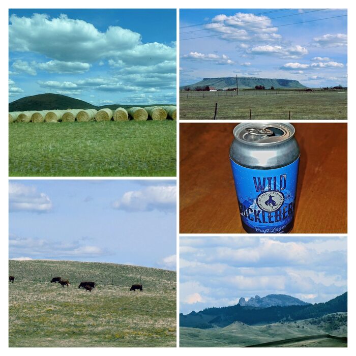 We started to leave the mountains arriving in the wide open plains outside of Great Falls thus the hay bales, buttes, cows and I found my Huckleberry beer at the local store. The lower right photo shows a unique mountain that is to the south of where we are driving. This is a zoom. Could be Mount Cecelia.