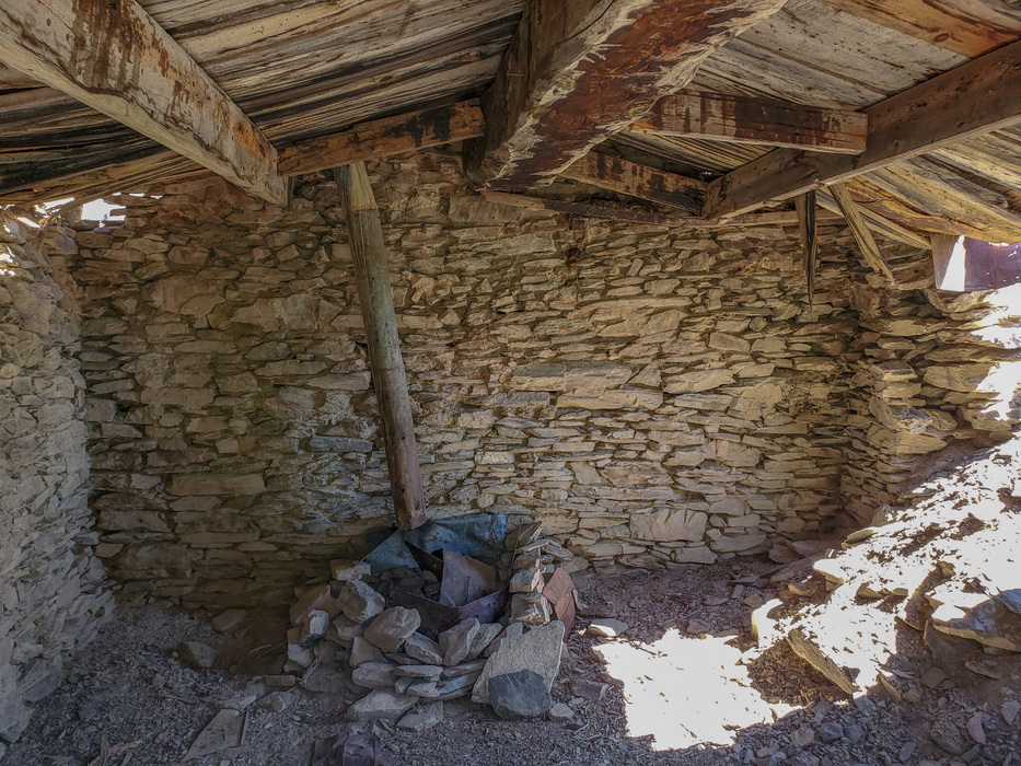 Interior of the shack. There was probably a wood stove where the stove pipe is located. The rocks in the wall had originally been held in place with adobe mortar which has washed away over time much like rock walls in ancient Indian structures in AZ.
