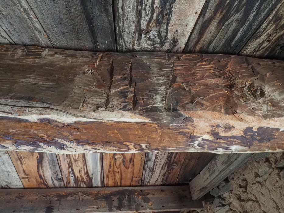 The massive center beam holding up the roof appears to have been hewn to a square shape with an axe.