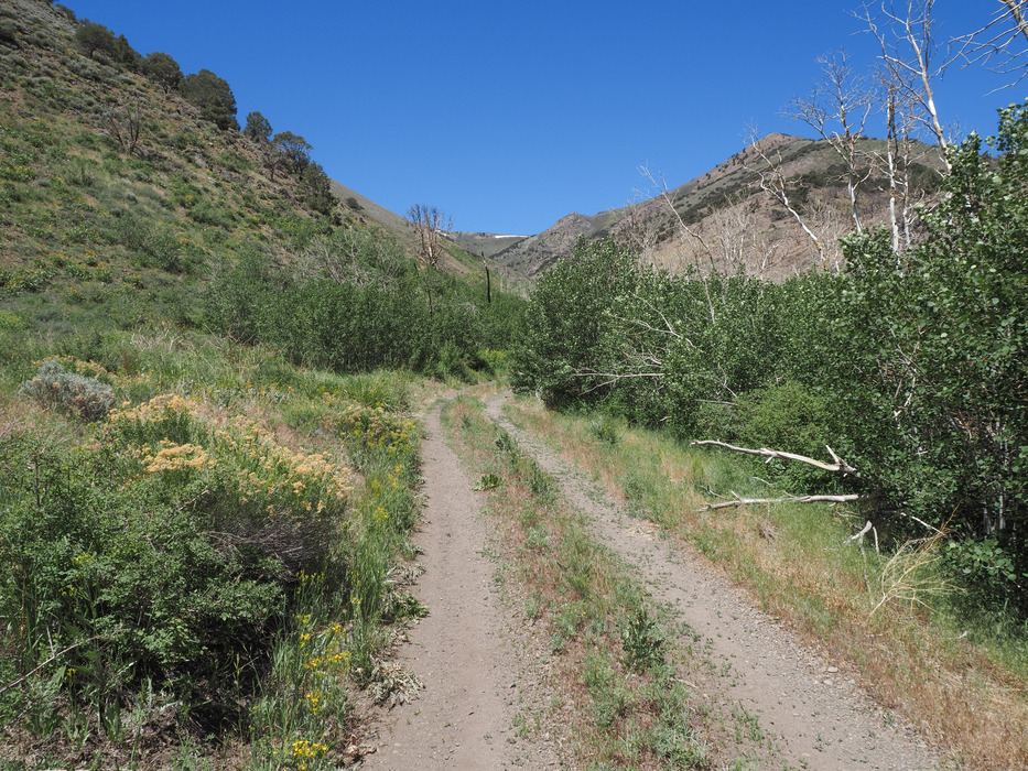 Hiking up the Ophir Canyon Road from the Ophir mill site towards the top of the distance ridge at the end of the canyon. I would run out of time and energy about 3/4 mile and 720 ft elev from my goal. I had been warned by an old backpacker working the bar at the Tonopah Brewery that the road was impassable except for an extremely modified 4x4. He was wrong although there was a steep rocky section where I would have been concerned about my vehicle starting to slide backwards ending up buried in the thicket of aspen in the gully below.